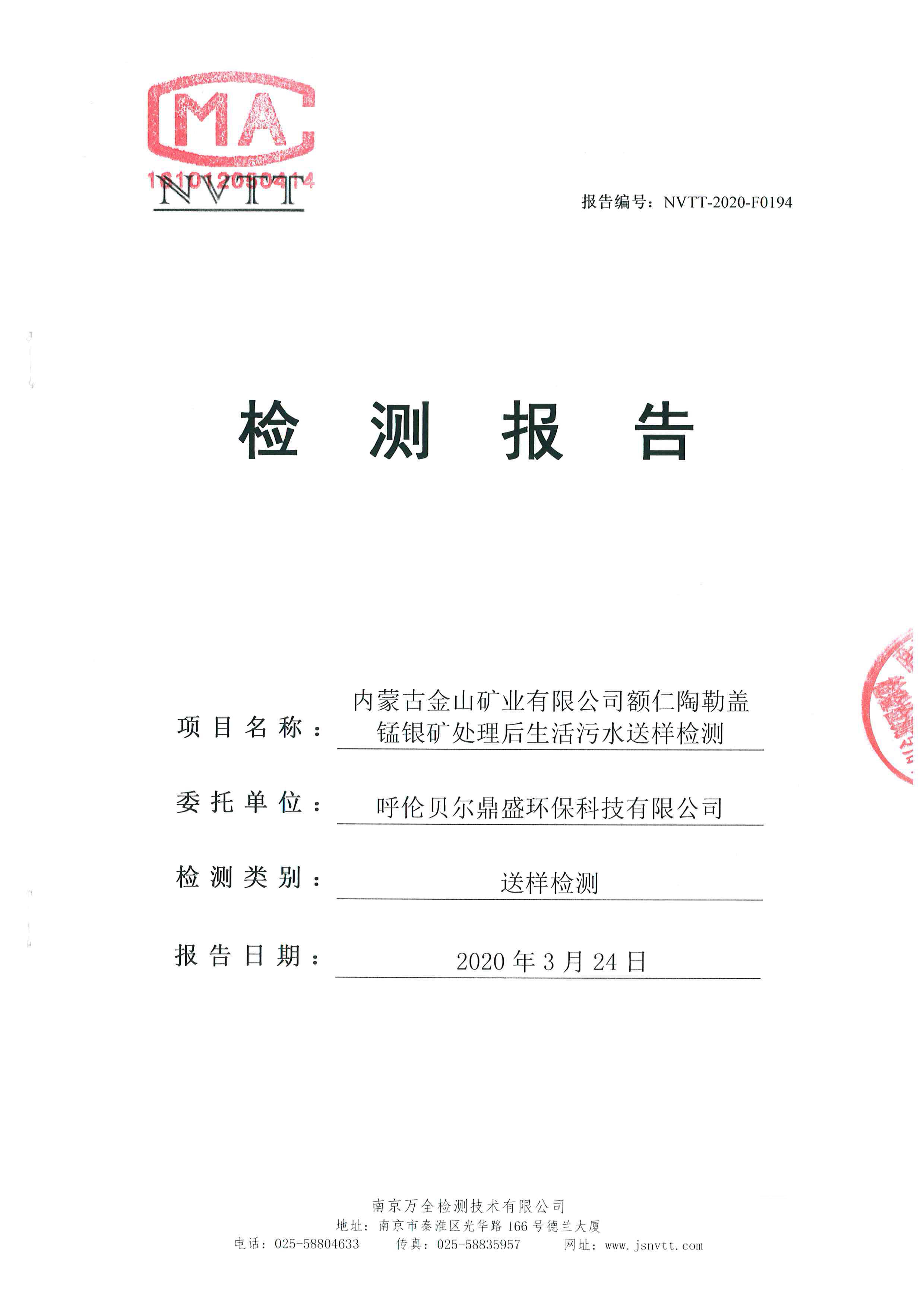 关于内蒙古金山矿业有限公司生活污水检测报告(2020第一季度)
